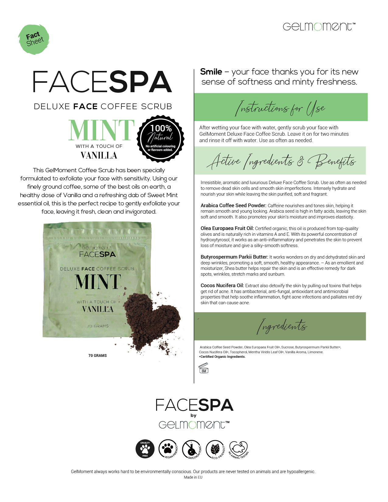 Specially formulated for use on the sensitive skin of your face, this Deluxe Face Coffee Scrub is the perfect mixture of finely ground coffee, Vanilla, and refreshing Sweet Mint essential oil. It will leave your face fresh, clean and moisturized.